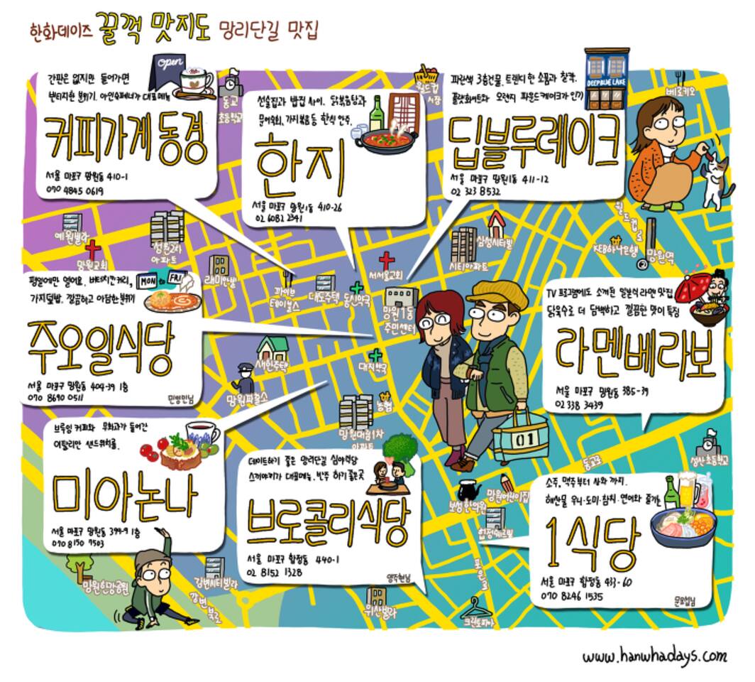 ‘Mangwon Market’ is located near Hongik University, and recently became a popular destination among young people. You can buy fresh fruits, vegetables, fish and meat in the market or visit famous restaurants around. You can also come across a number of celebrities as many musicians and artists are living in Mangwon-dong area. A street near the market got a new name ‘Mang-ri-dan Street’, has so many gourmet restaurants, small but unique and delicious. You can easily find cozy restaurants renovated from resident houses, such as French home meal restaurant ‘Star of Iceberg’, ‘Rico Rico’ which is famous for its homemade pork cutlet, Japanese late night restaurant ‘Broccoli Restaurant’, ‘Dongil-Ru’ which sells ‘Hama Jjamppong’(Chinese-style noodles with seafood and vegetables) as a side dish for drinks. You can realize the popularity of the restaurants if you see the long queues in front.