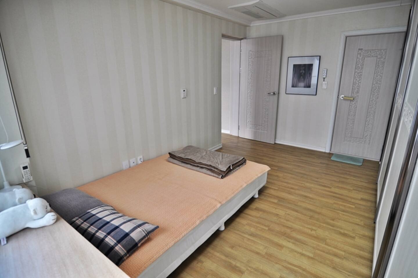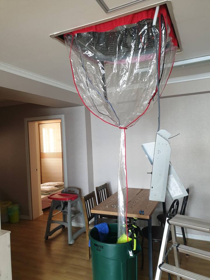 거실에 천정형 중앙제어 에어컨 설치되어 있습니다. 매년 냉난방기 종합세척 관리사님의 분해 세척을 마쳤으니, 안심하고 사용하시기 바랍니다. 안방의 작은 에어컨은 사용 불가입니다.