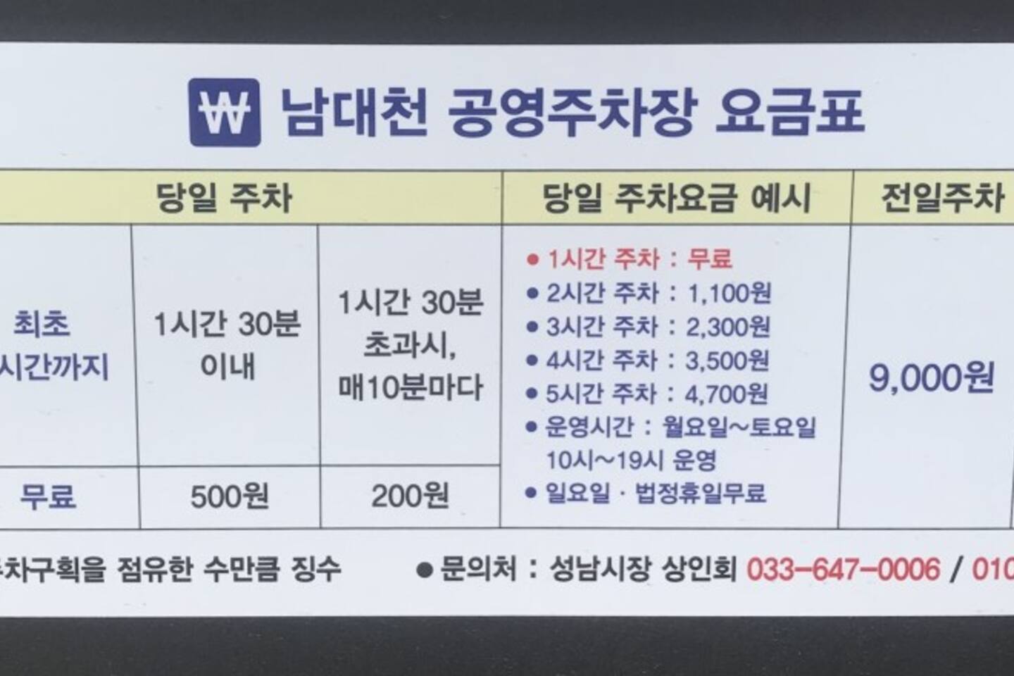 KTX강릉역과 버스터미널에서 1.5km 기본 택시요금 거리입니다. 집앞은 주차 단속지역이라 10분이상 정차하시면 안됩니다만, 남대천 공영주차장이 불과 100미터 거리에 있습니다. 요금 안내 표지를 사진에 등록하였으니 참고 부탁드립니다.